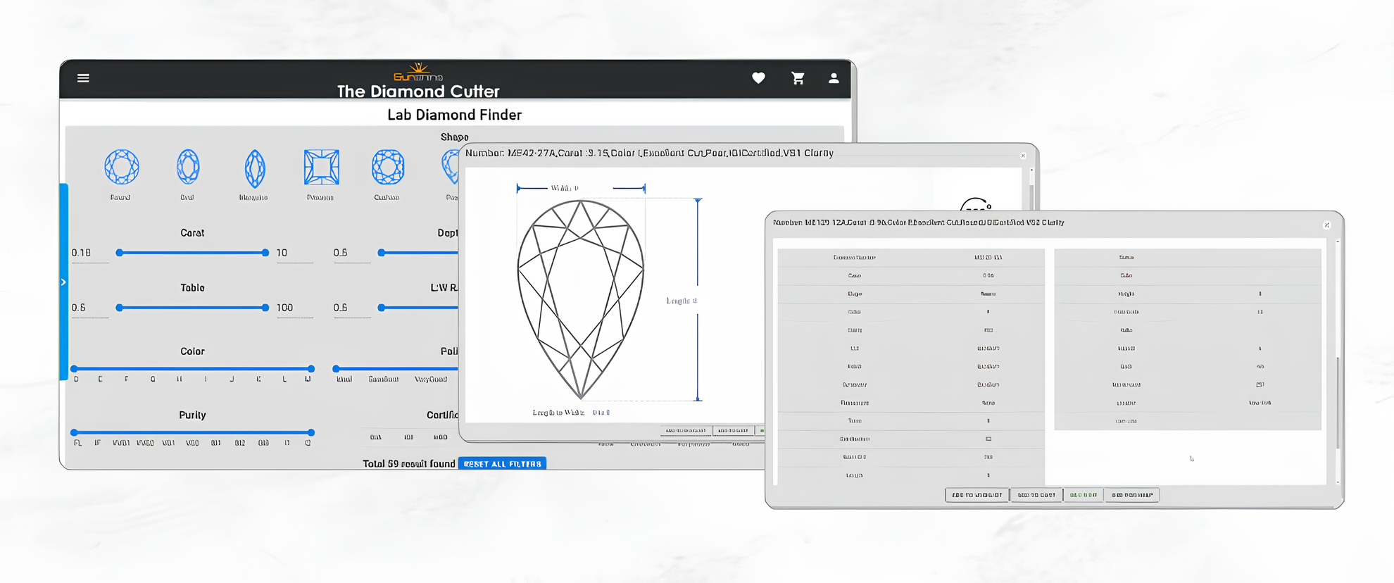 Diamond Search : Tailor your search based on specific diamond criteria such as carat weight, cut, color, clarity, and more, Advanced filters for precise diamond selection according to individual preferences.